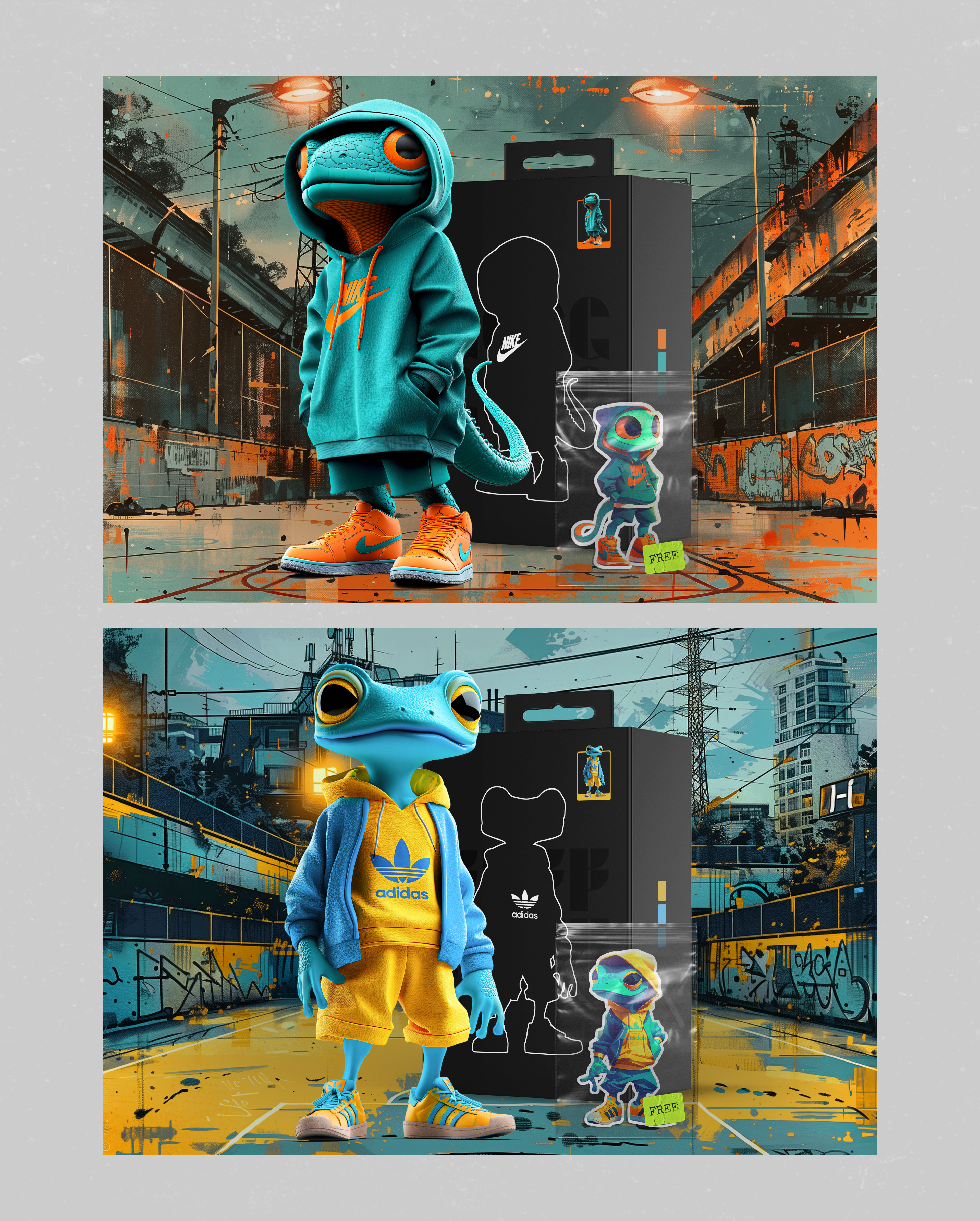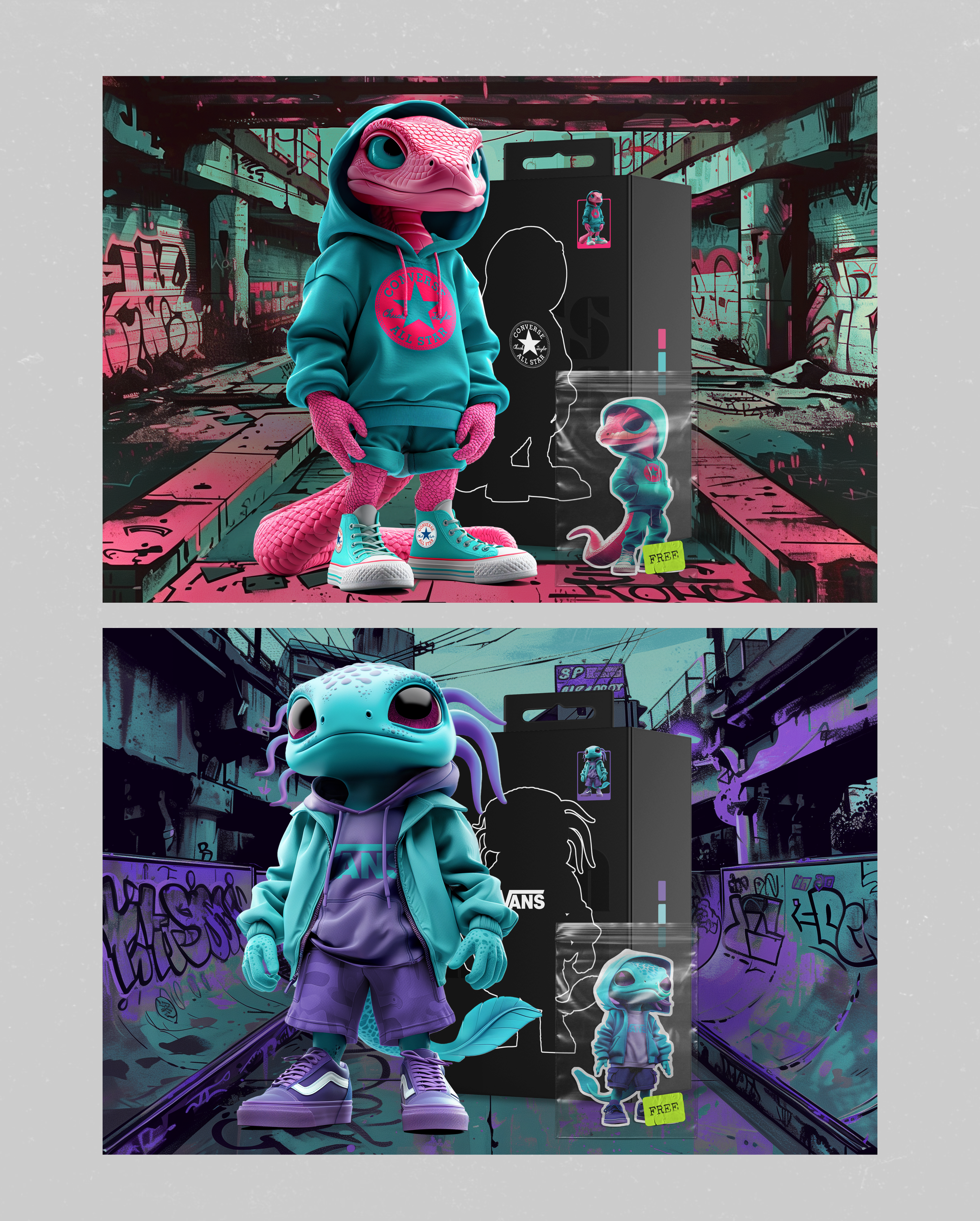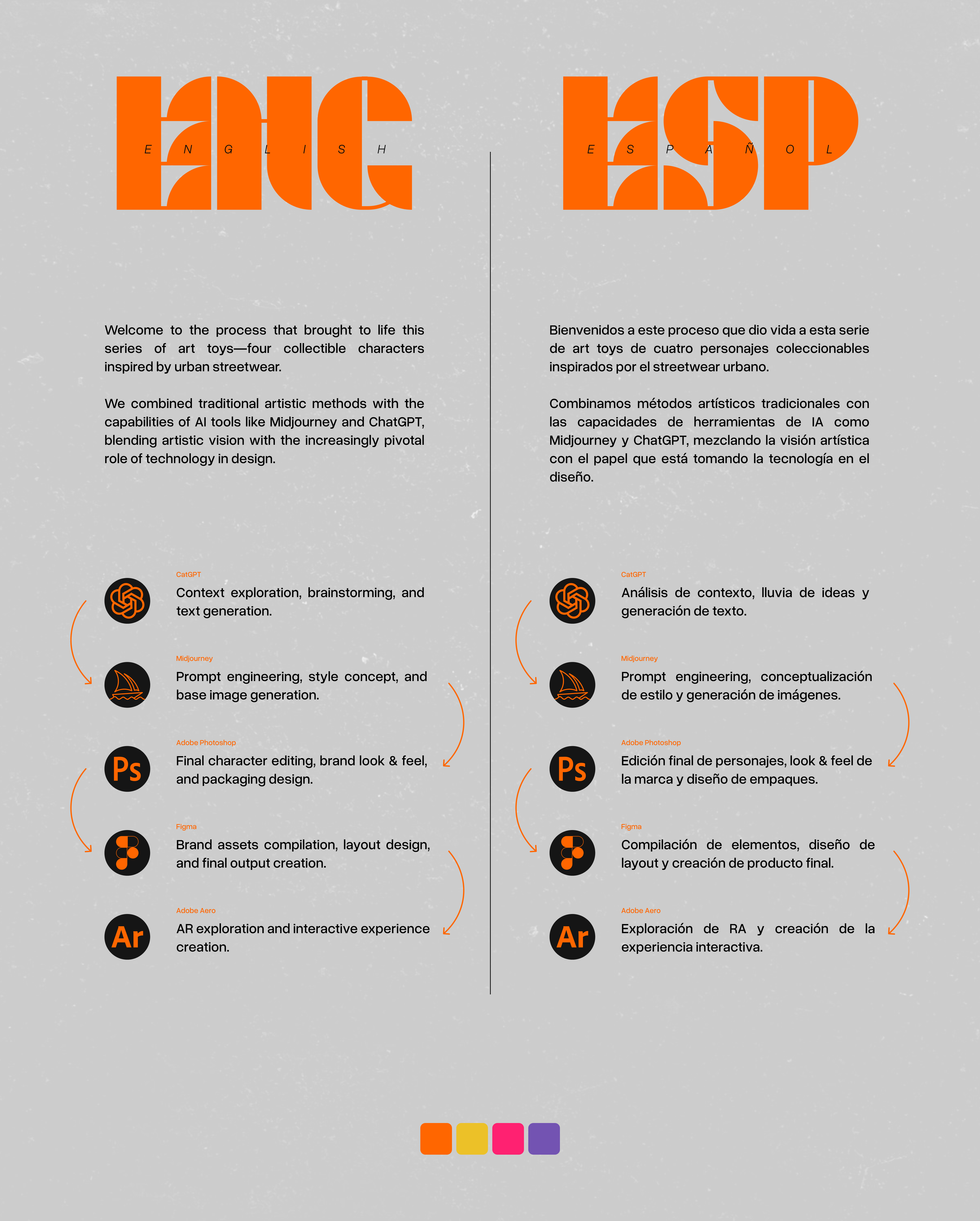 We combined ChatGPT, Midjourney, Photoshop, Figma, and Adobe Aero to create a set of four Art Toys brought into real-world form. Here you’ll find a detailed breakdown of our process, and if you’d like to see the full presentation, you can visit the project on Behance.